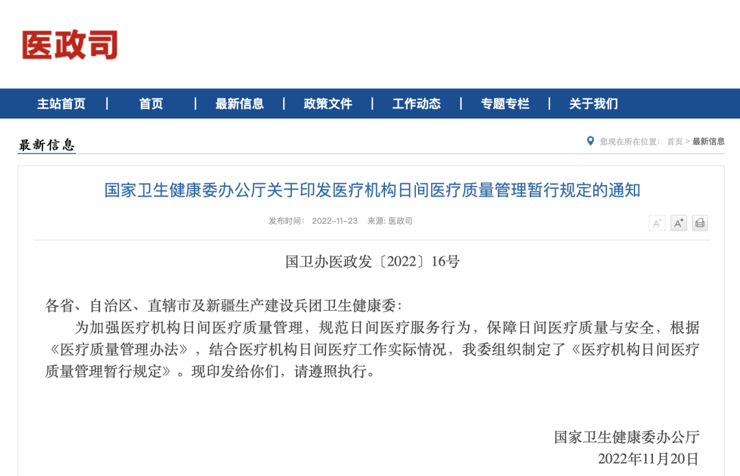 《医疗机构日间医疗质量管理暂行规定》发布,明确卫生健康行政部门的监督管理职责